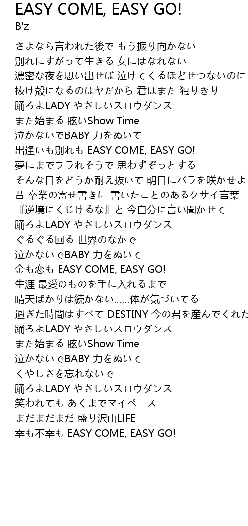 この曲の歌詞、素晴らしいですよー!おなじみB'zの「Easy Come, Easy Go!」という作品の歌詞についてご覧ください。聴けばきっと悩みがちっぽけに思えてくるはず! ここむんと B'z「Easy Come, Easy Go!」 A post shared by B'z (@bz_official_insta) on at 430am PST BGuess that's just the way it goes, easy come, easy go I just need to let it go, turn it down and lay low It's just the way it goes, easy come, easy go Sometimes I drive a little too fast Think I'm runnin' from demons of my past So I wrote a song to help me slow down Keep my mind straight, but it's a bit late I'm not gon' lie to you, I miss you so much Tell me what I did wrong to lose touch? easy come easy goの意味 (meaning of "easy come easy go") easy come easy go は日本語のことわざである「悪銭身に付かず」とほぼ同じ意味 となります。 悪銭身につかずとは、不当な手段で得た金銭は、とかくつまらないことに使ってしまい残らないものだという教え。 「悪銭」とは、盗みやギャンブルなど
